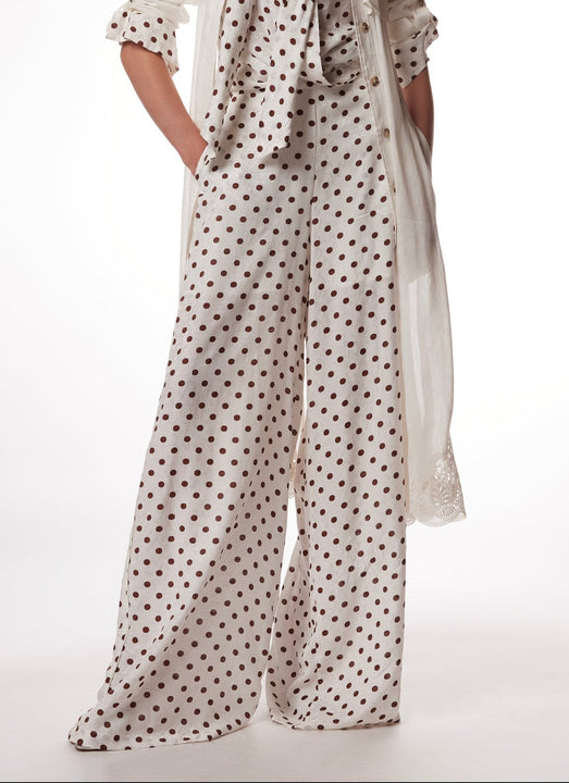 The Marta Pant in Brown Polka Dot is an effortlessly chic statement designed to bring ease and personality to everyday dressing. Featuring a flowing wide-leg silhouette, this style moves beautifully with every step while maintaining a relaxed yet refined feel.