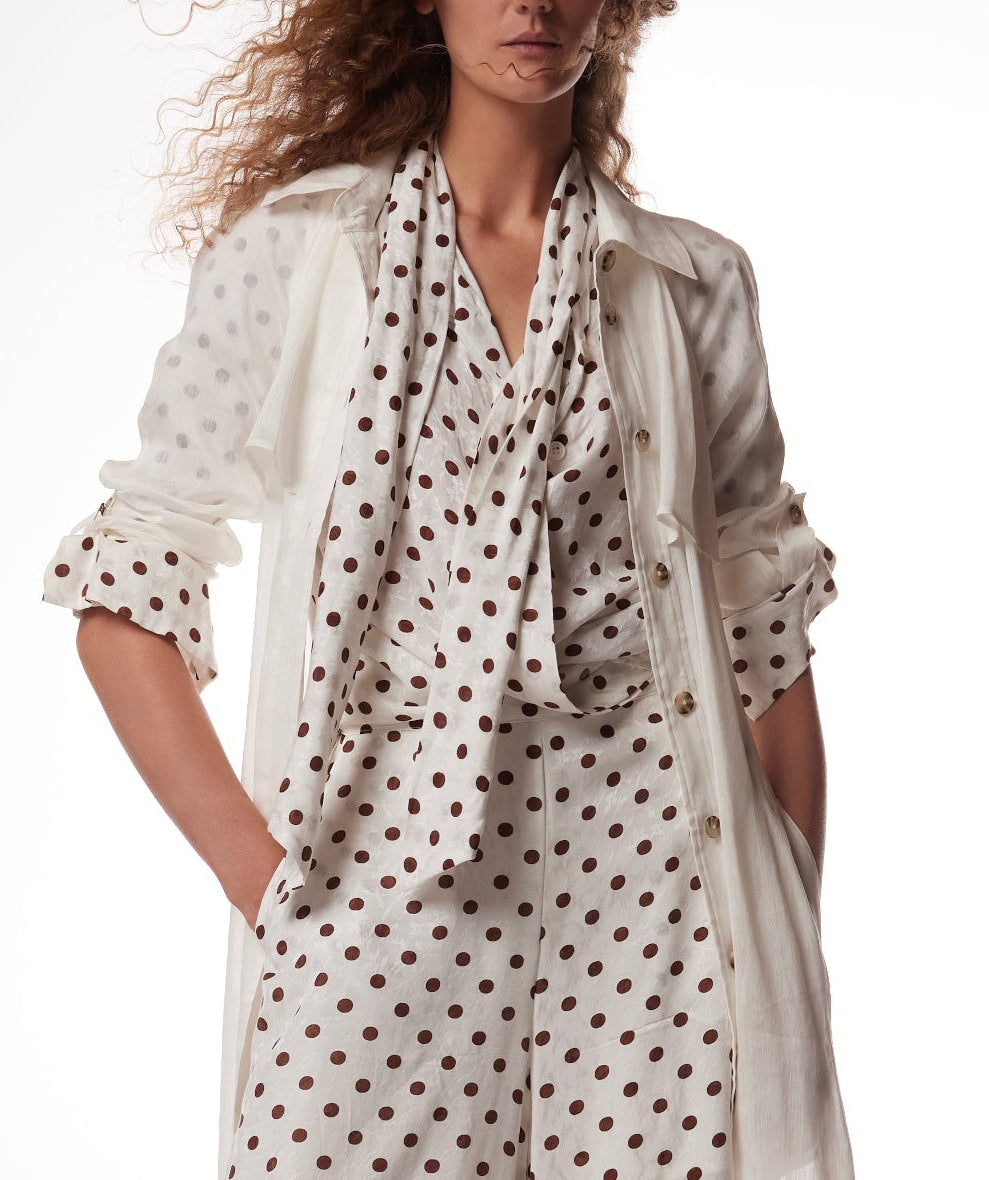 The Sally Blouse in Brown Polka Dot is a refined wardrobe staple with a playful, modern twist. Designed in a lightweight, flowing silhouette, this button-front features a softly draped neckline finished with a self-tie detail that adds movement and femininity.