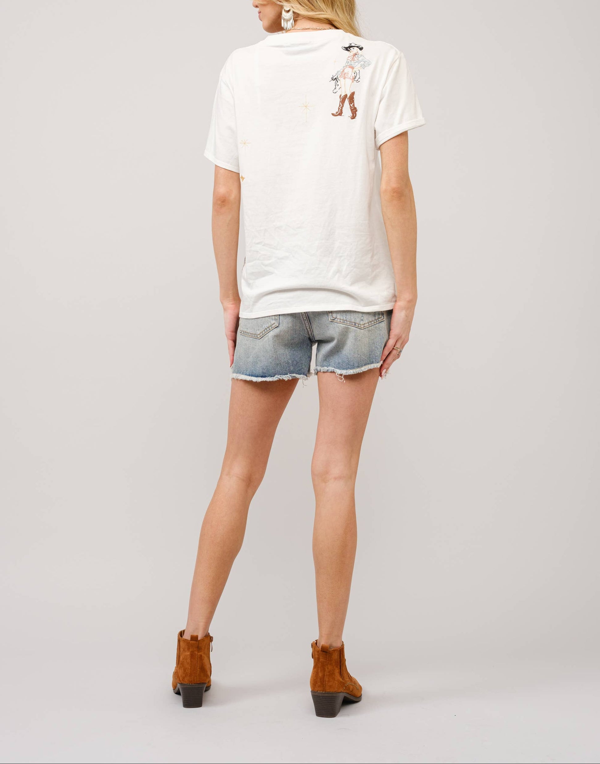 This regular fit T-shirt features embroidered cowgirl motifs and a graphic print inspired by a novelty tablecloth from the 1950s-1960s 100% Cotton Model is 5'8" and wears a size Small