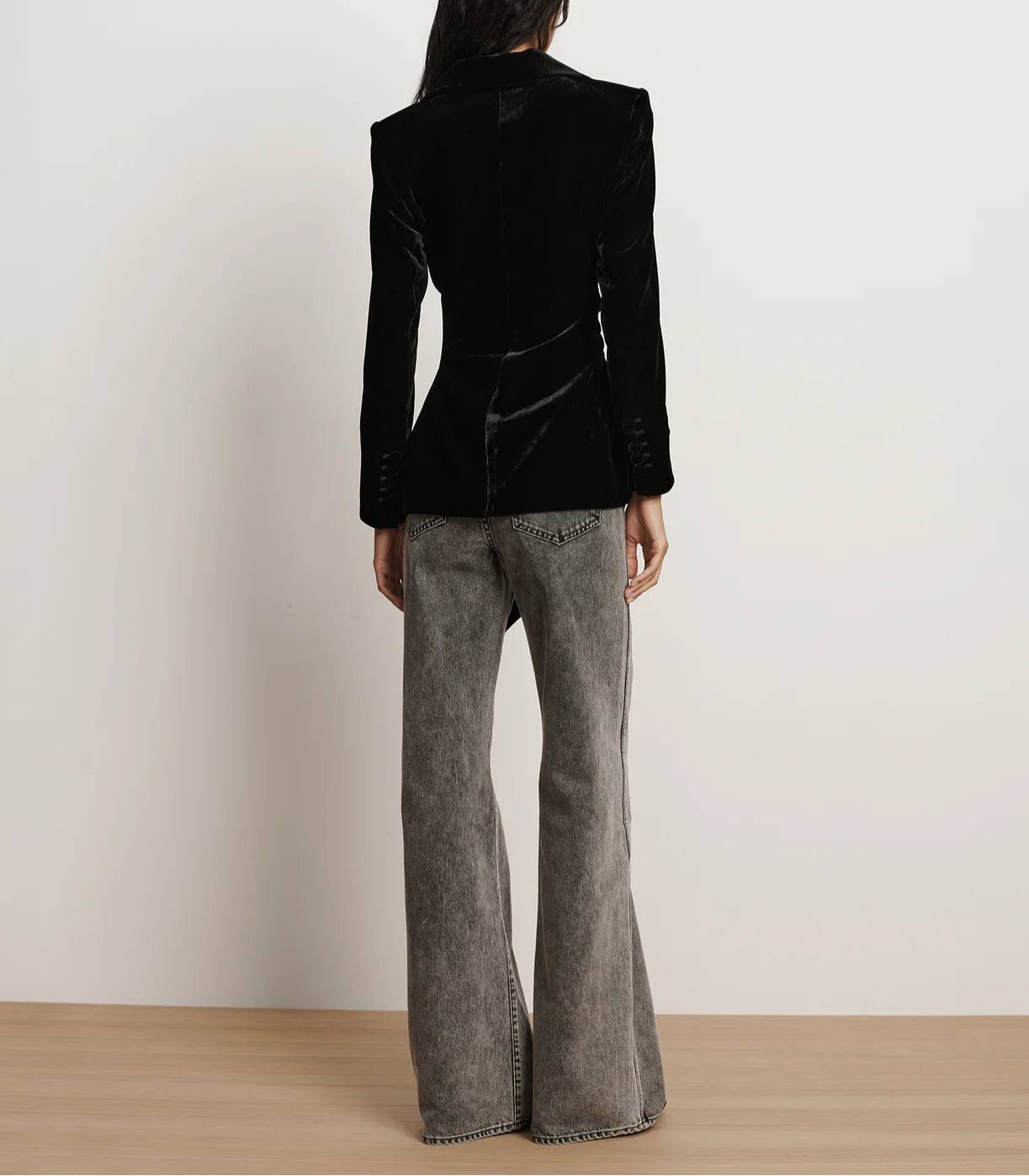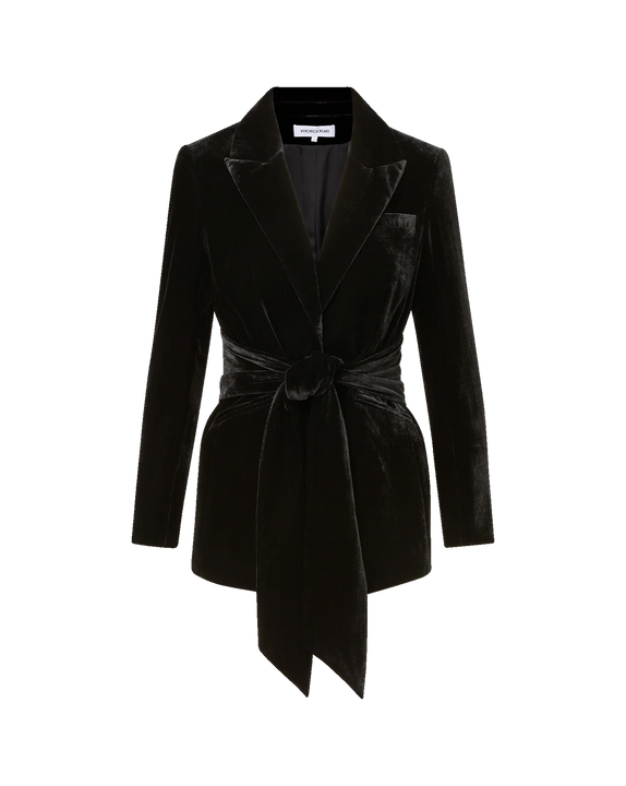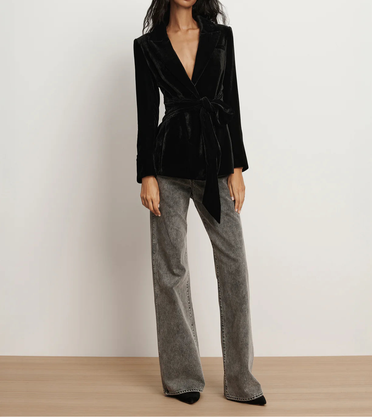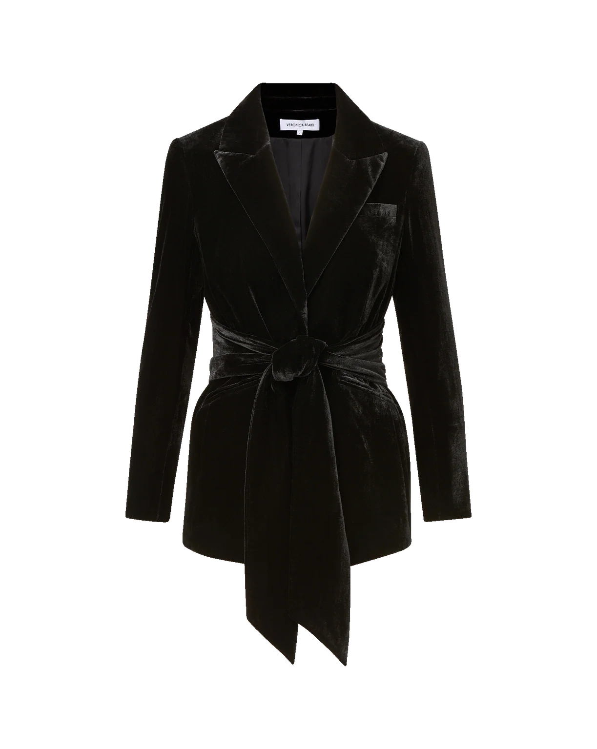 An elevated twist on the classic blazer. Crafted from luxurious black velvet, the Issel jacket features a relaxed, elongated silhouette and a wrap-style tie to cinch and define the waist. A peak lapel, chest welt pocket, and self-covered buttons at the front and sleeves enhance its clean, streamlined appeal. Perfect for event dressing, this velvet blazer pairs with the coordinating Alex pants for a chic tailored set.