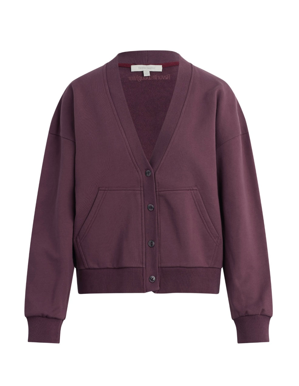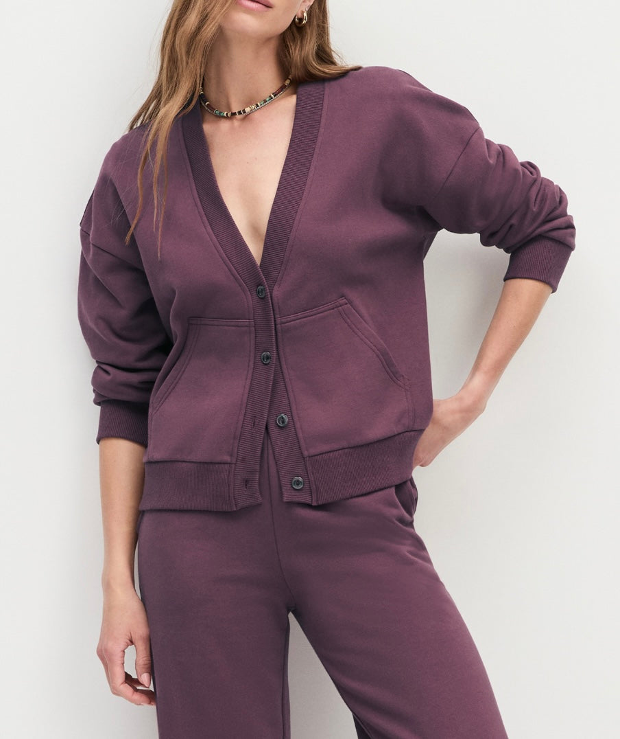 The Cutesy Crop Cardigan is exactly what it sounds like. Cozy, soft, and cropped just right. Cut from 100% fleece, it has long sleeves and a low neckline that make it perfect for layering. Our favorite way to wear it is a set with The Boxer Wide Leg in matching Burgundy Dahlia