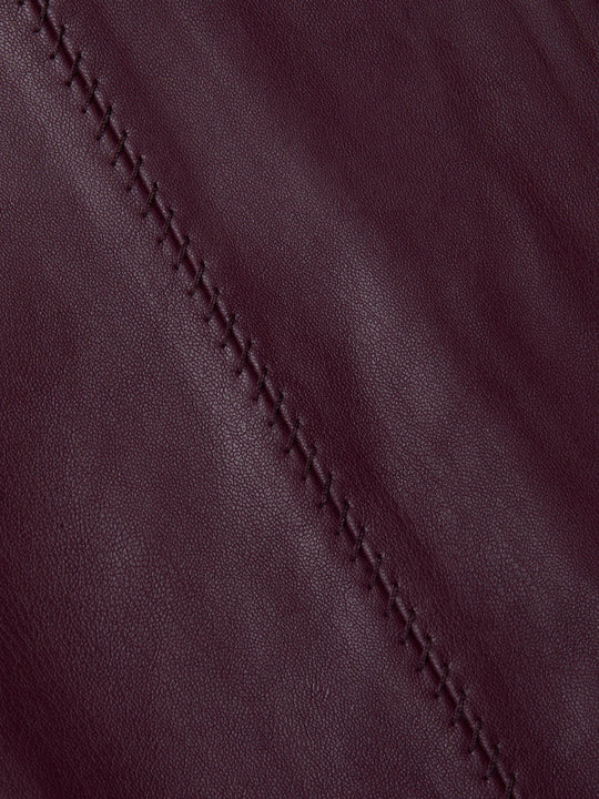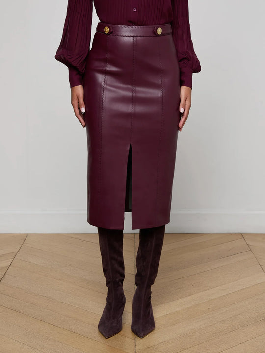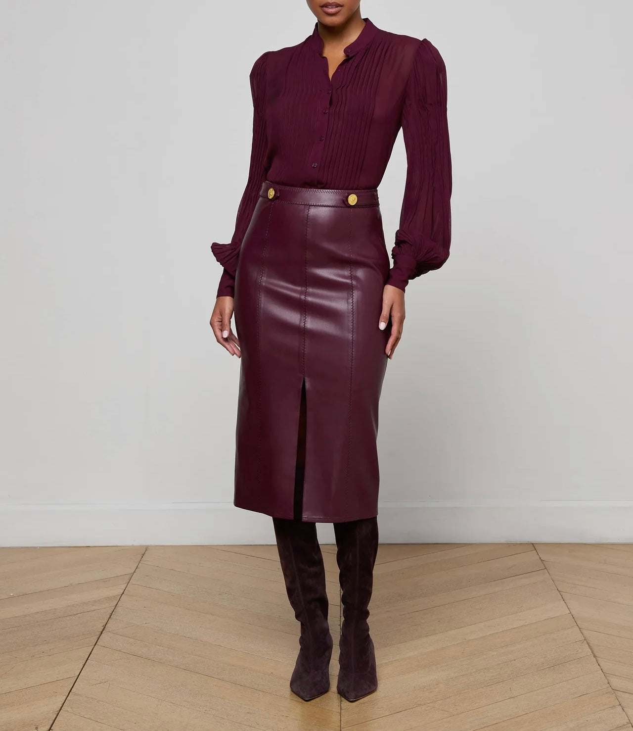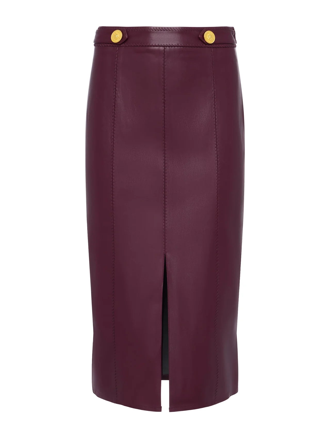 Sleek and sophisticated, this midi skirt is crafted from rich vegan leather in a deep port hue. Tonal whipstitch seaming and gold crest buttons lend a polished finish, while the front slit brings in the attitude. Pair it with a tucked-in blouse or sharp blazer for desk to drinks