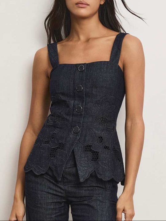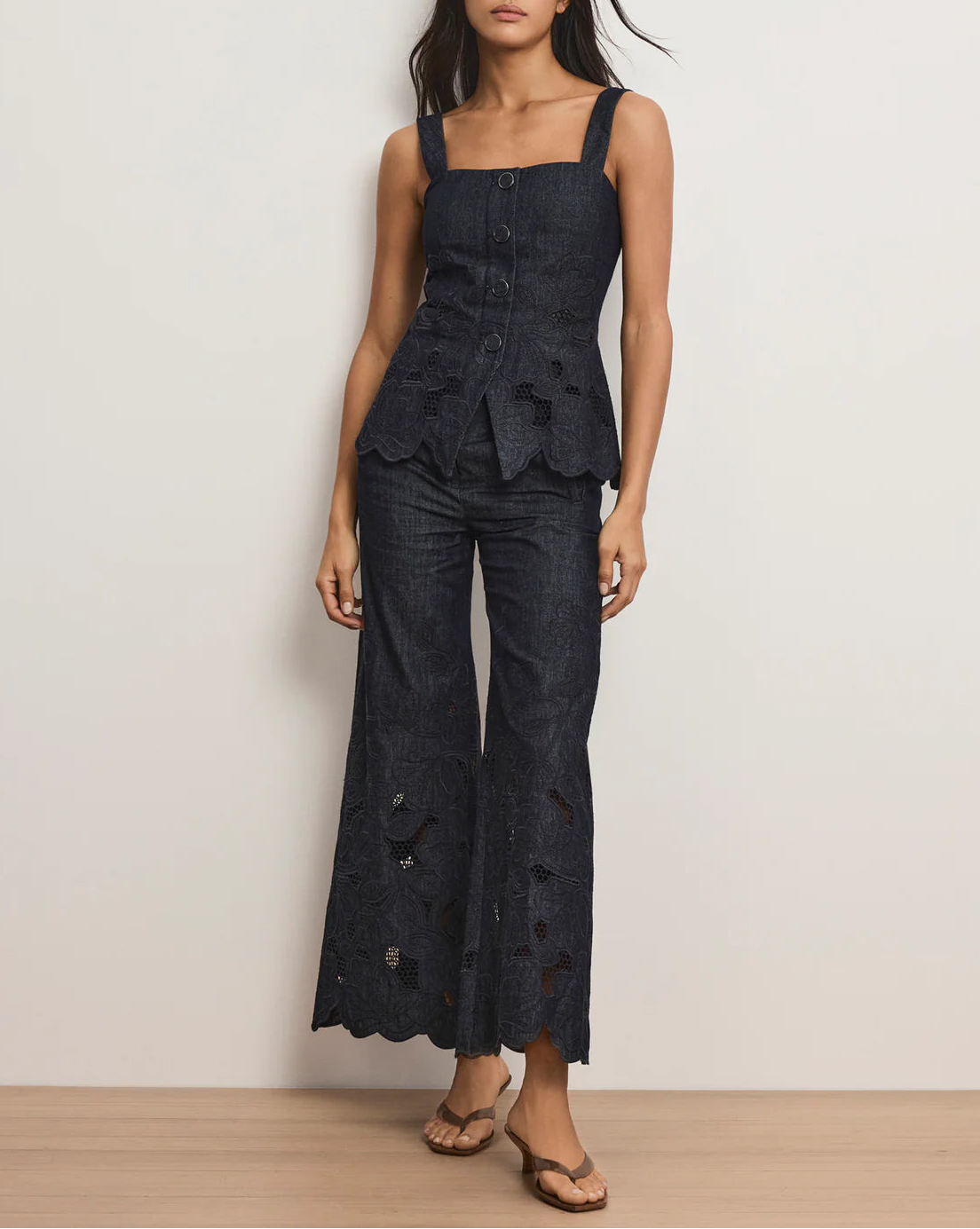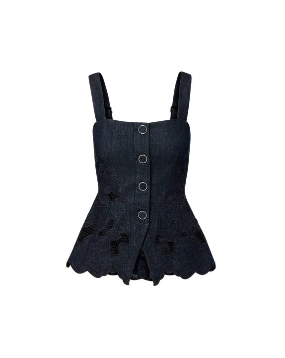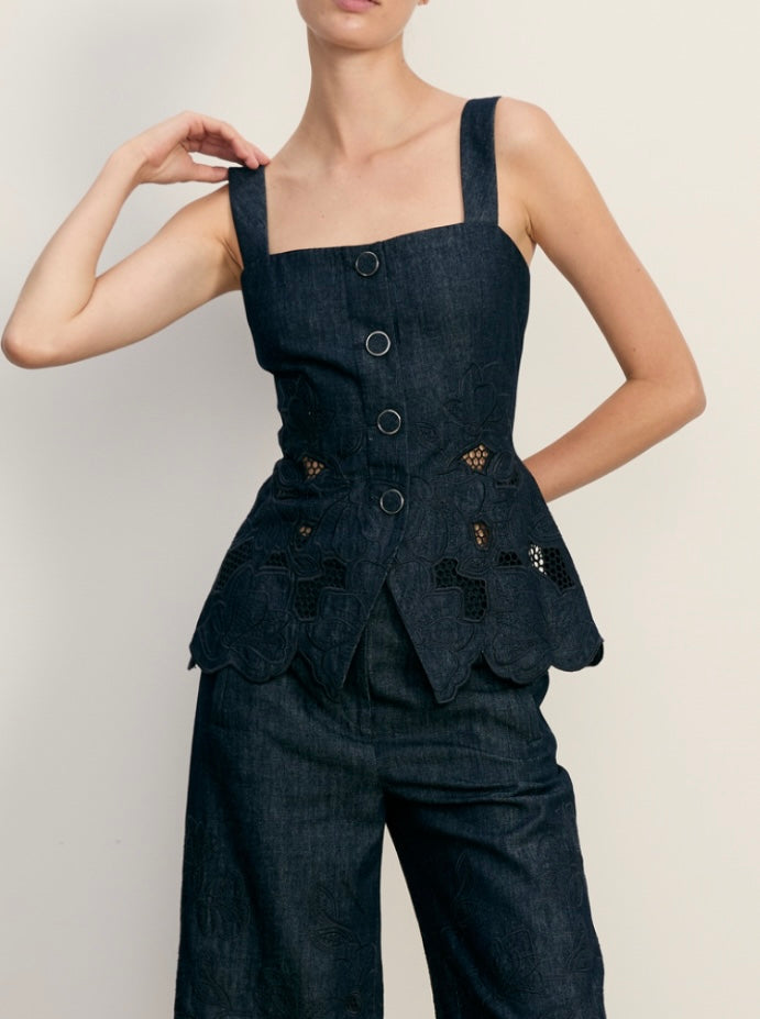 Expertly tailored from premium cotton chambray, the Mirielle top features eyelet panels and a feminine petal-scalloped hem. Designed with a square neckline and adjustable straps, it’s finished with decorative self-covered buttons down the front, a split hem, and a back zipper for easy on-and-off wear. Perfect for elevating the everyday, pair this navy top with VB denim or the matching Osborne pant for a chic, coordinated set.