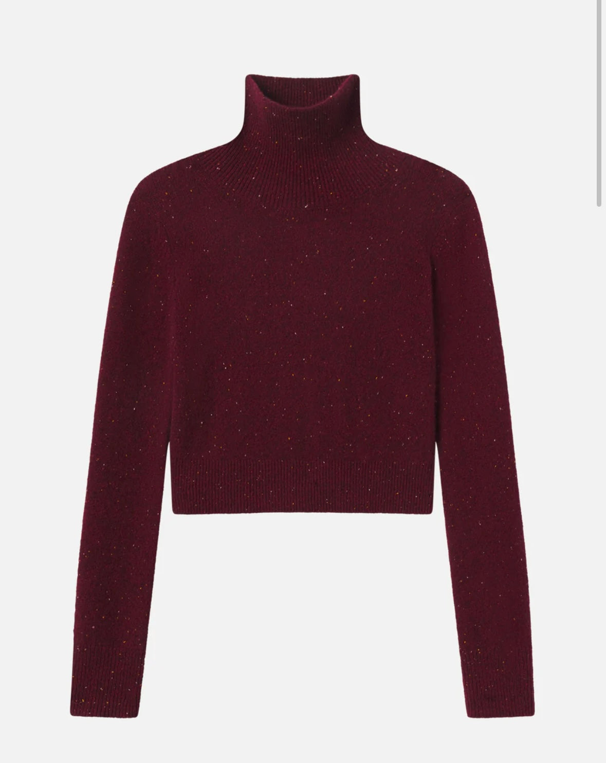 This pure cashmere turtleneck has a rich pinot color base, enlivened by multicolored flecks throughout. A slightly cropped silhouette with a high turtleneck.