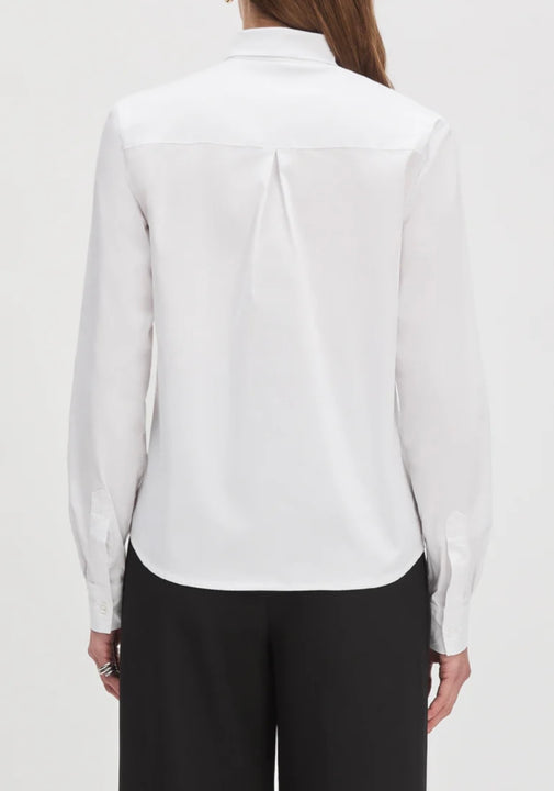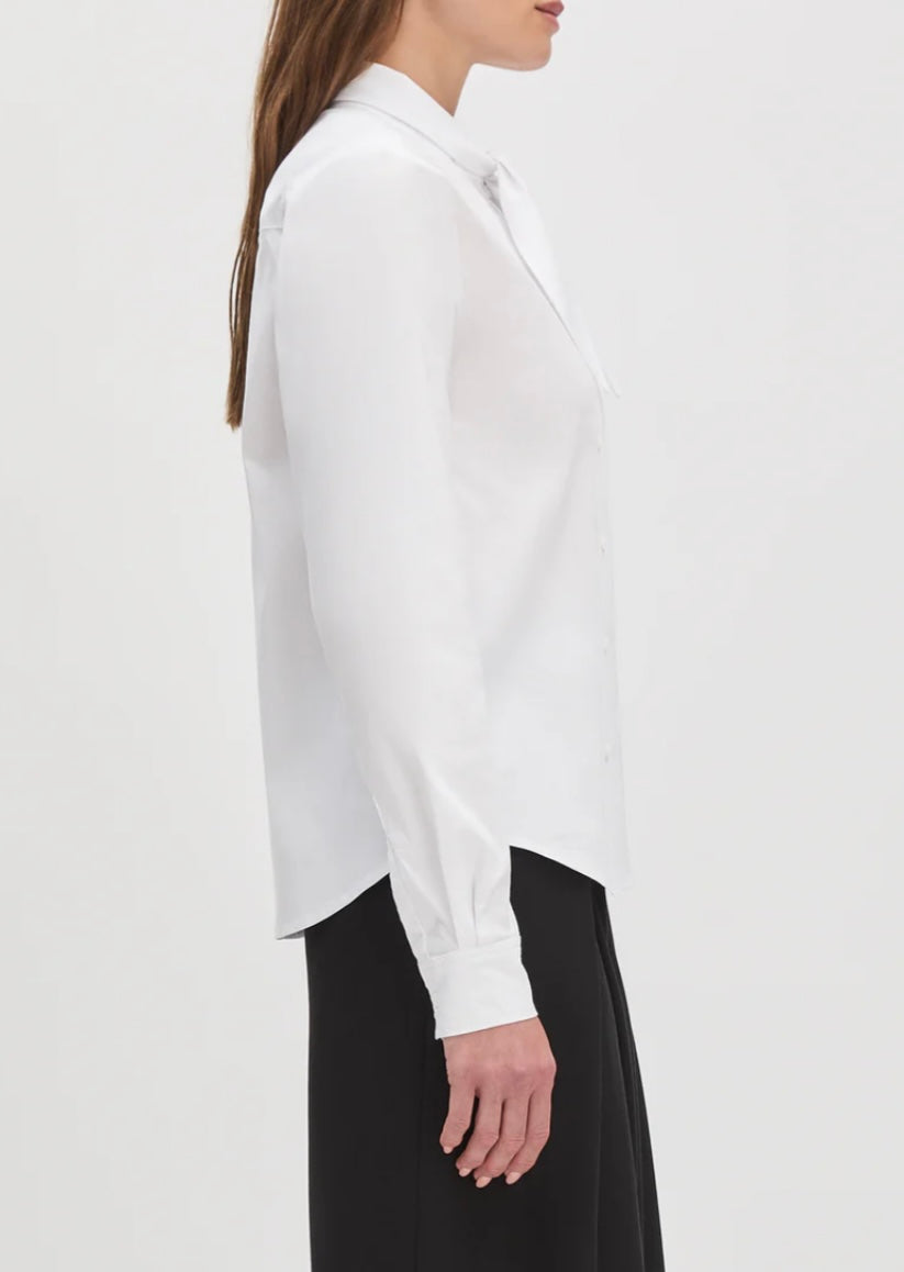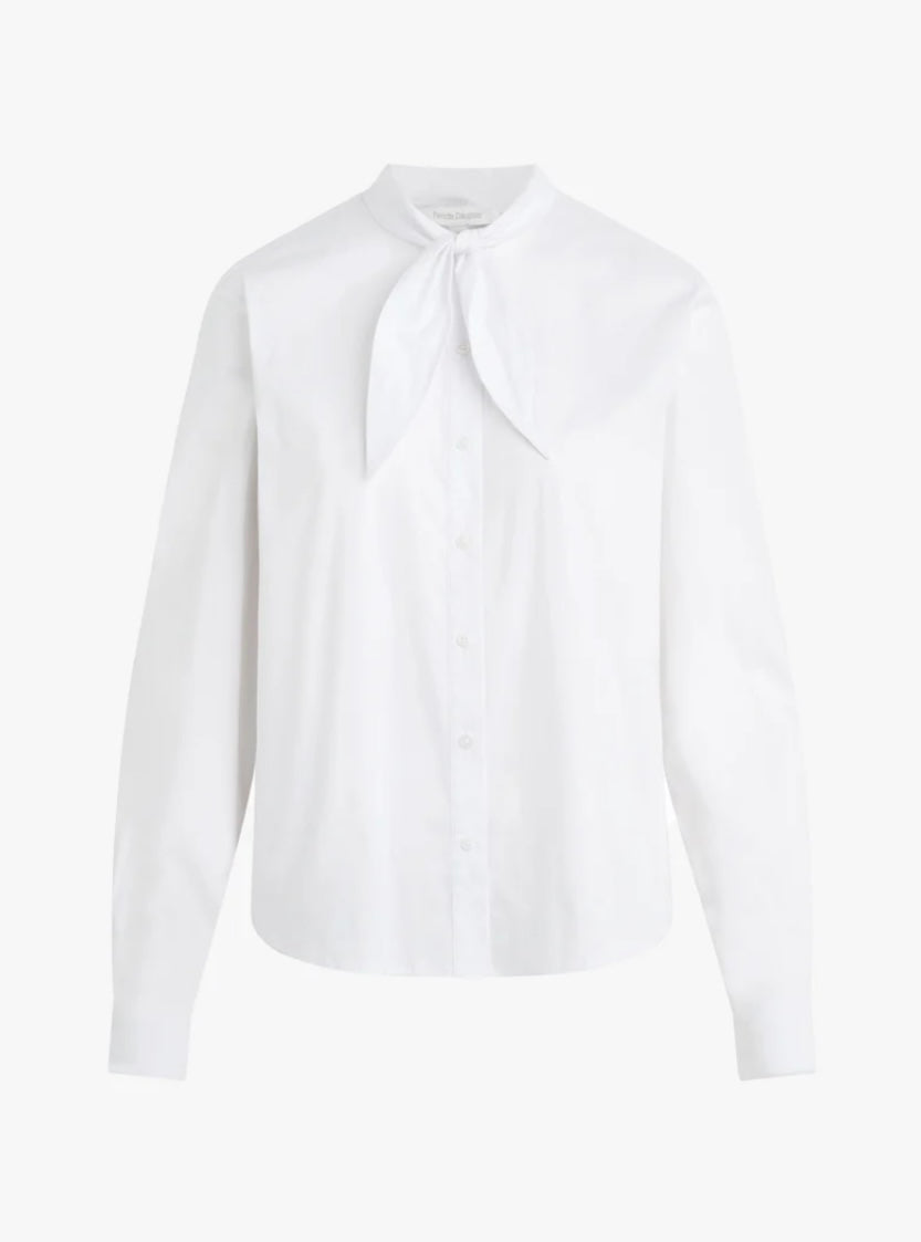 It’s giving French girl. A classic poplin shirt with a self-tie neck, button front, and an easy, in-between fit.