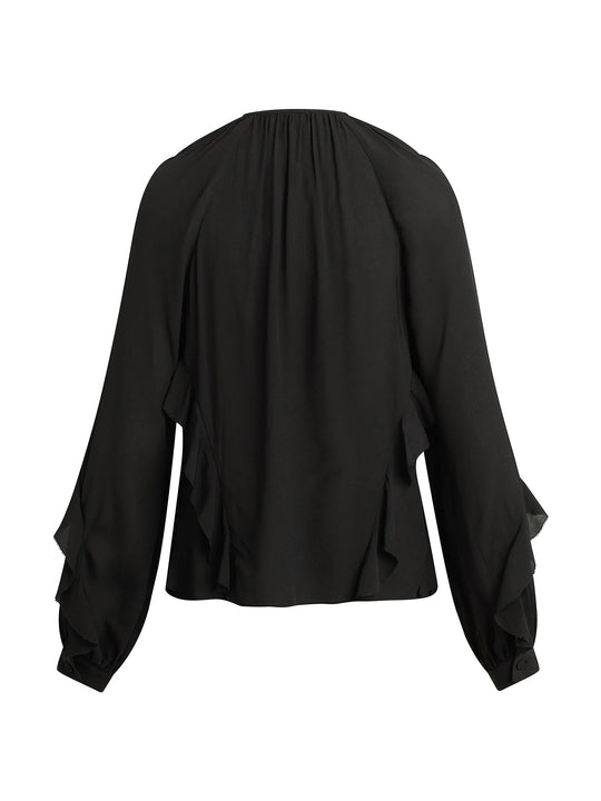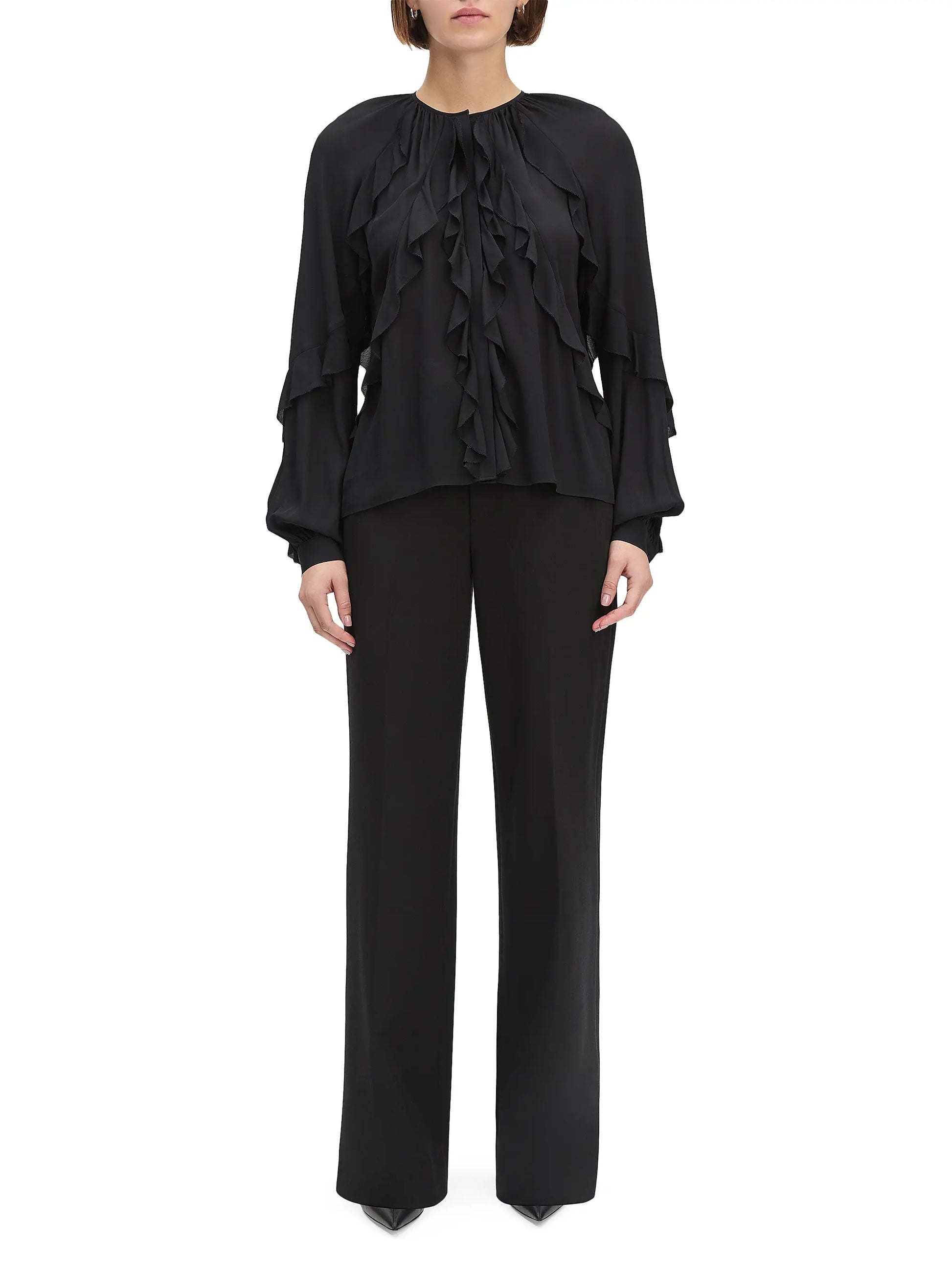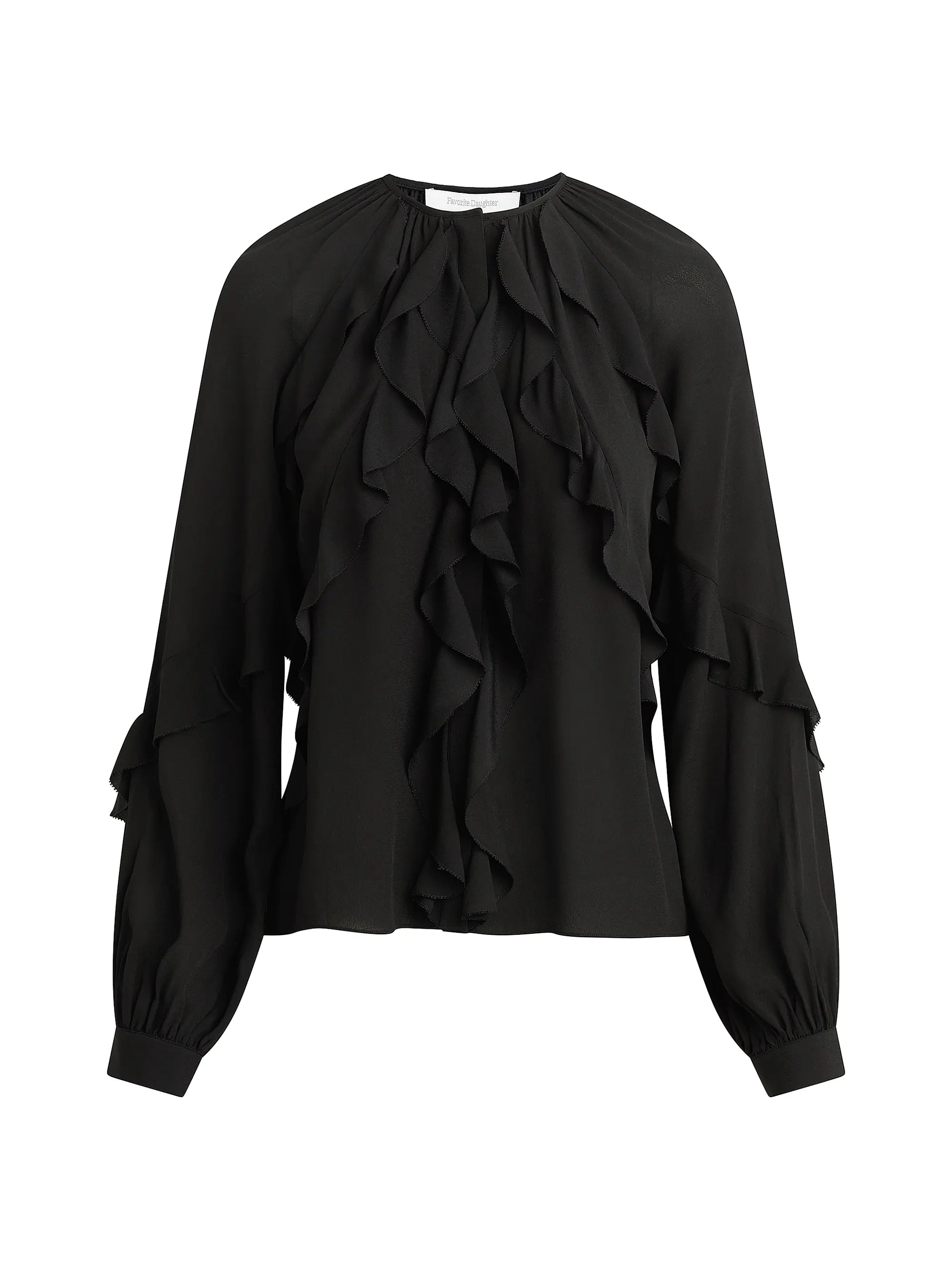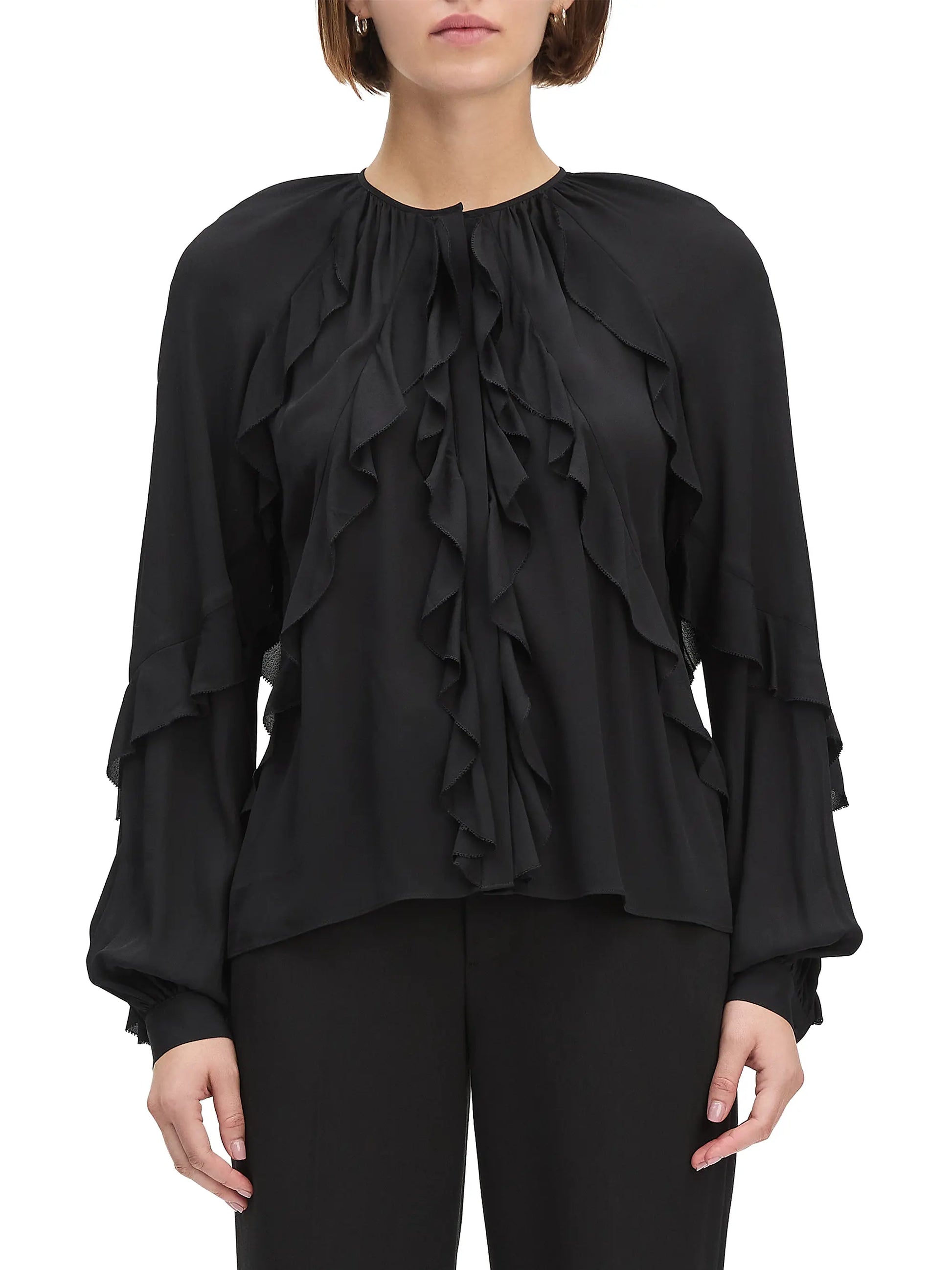 Styled with cascading ruffles, the Because Of You blouse from Favorite Daughter features a minimalist crewneck and long blouson sleeves.
