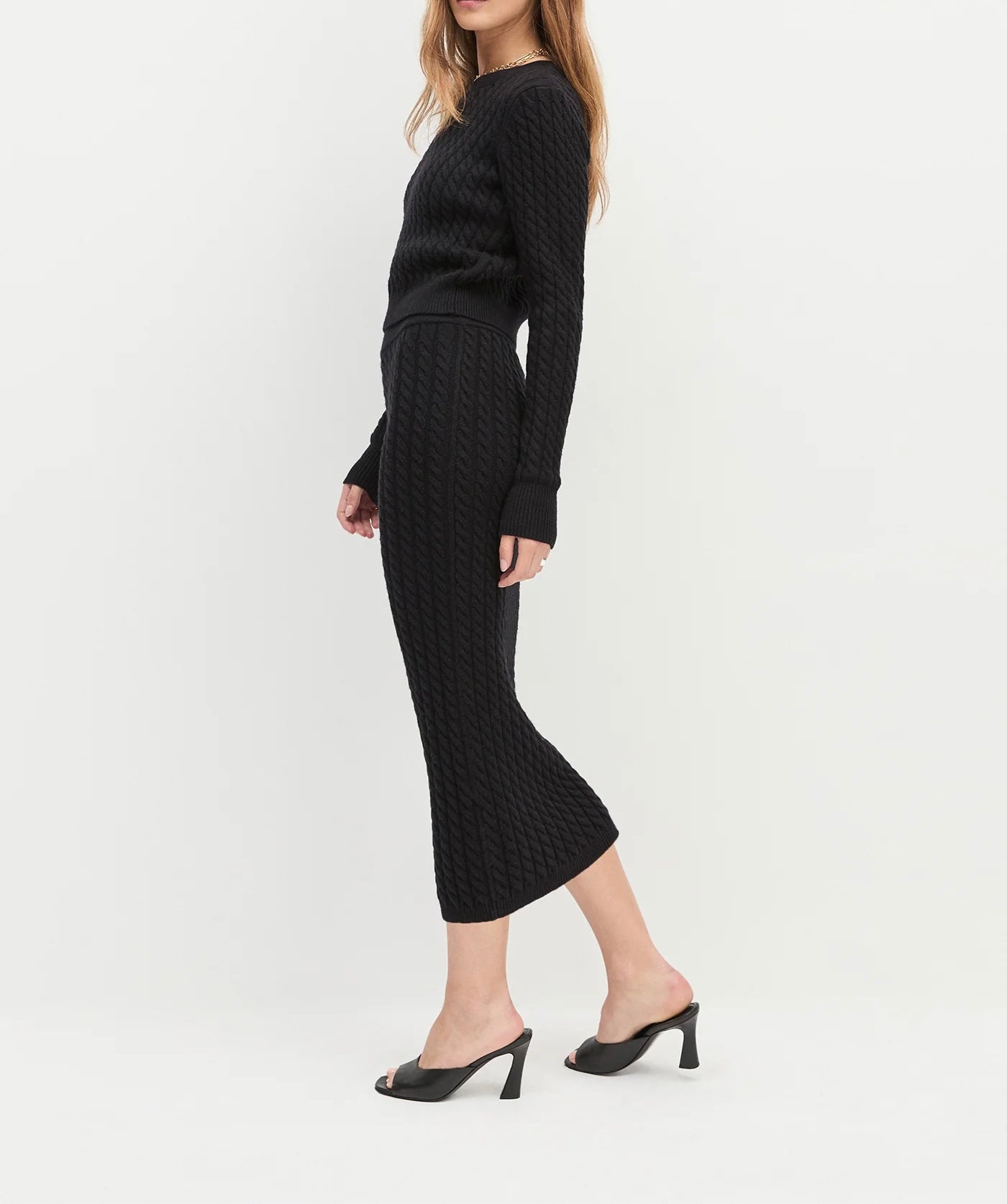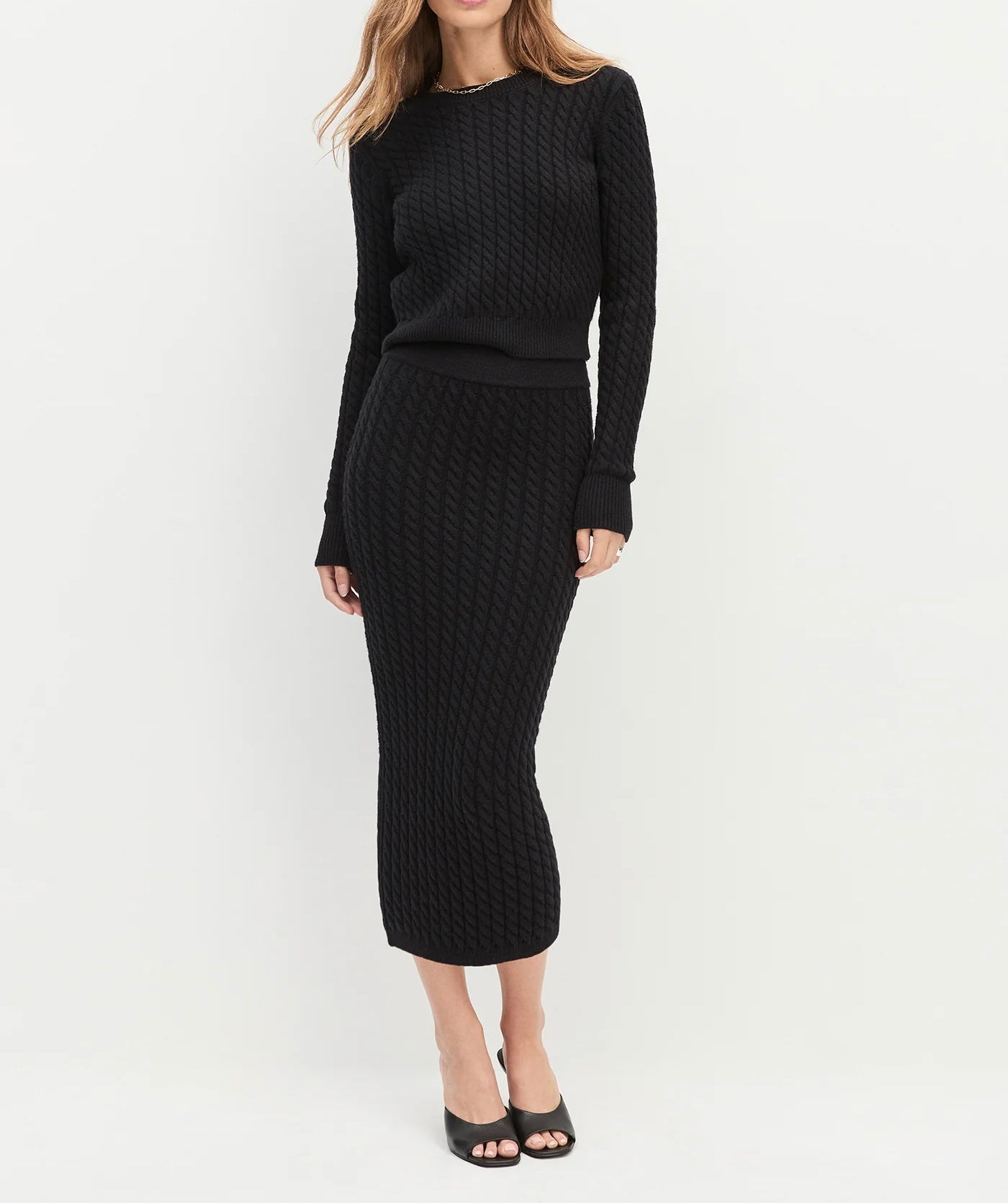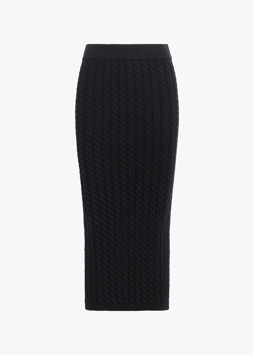 Fine cable stitching and a body-hugging silhouette, this 33.25" midi is knit from a soft viscose blend that feels as good as it looks. For a favorite feel-good look, pair it with the matching sweater.
