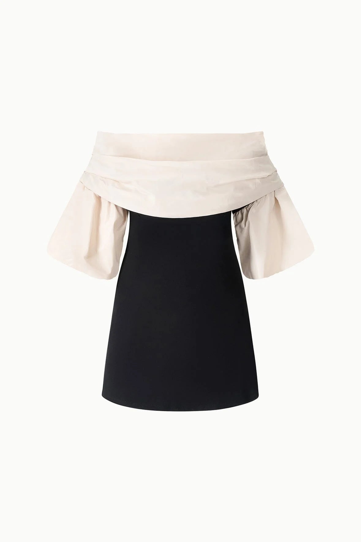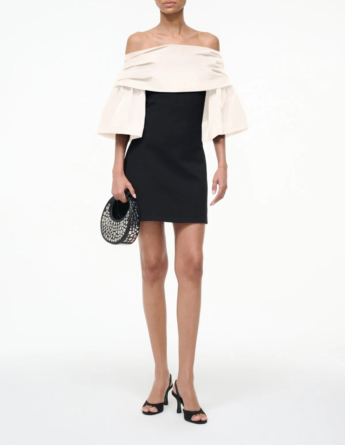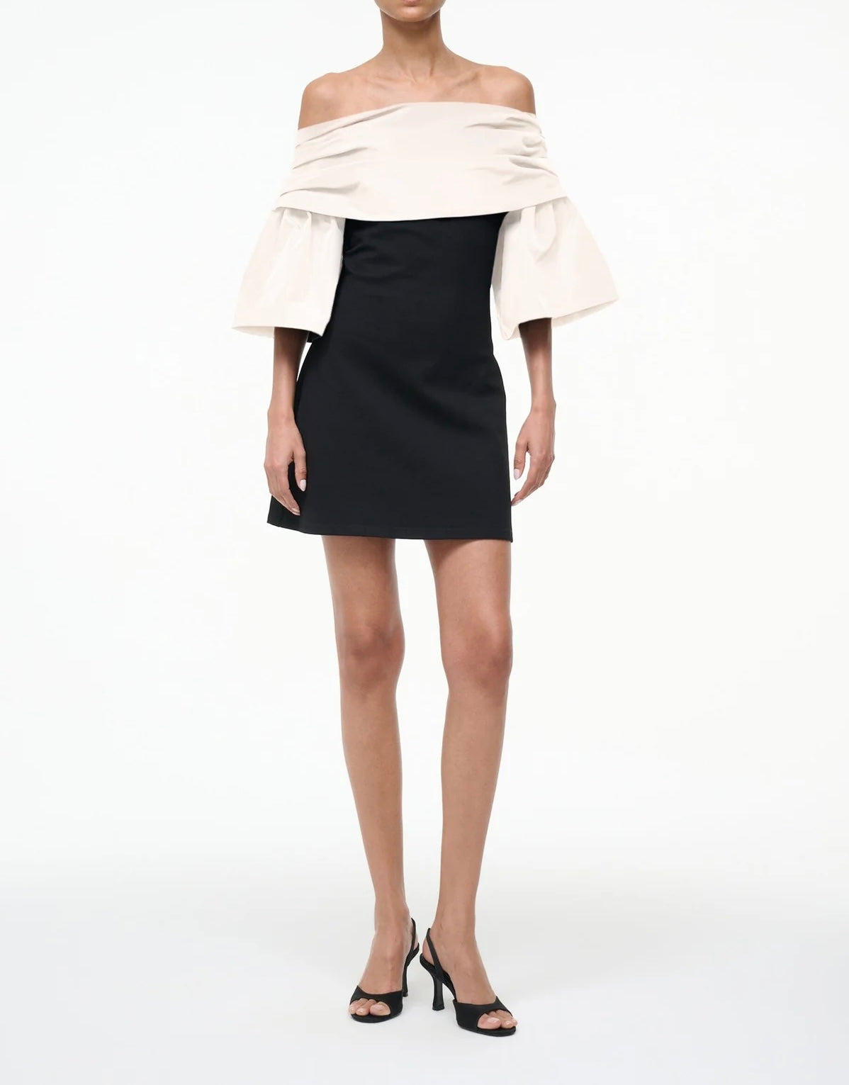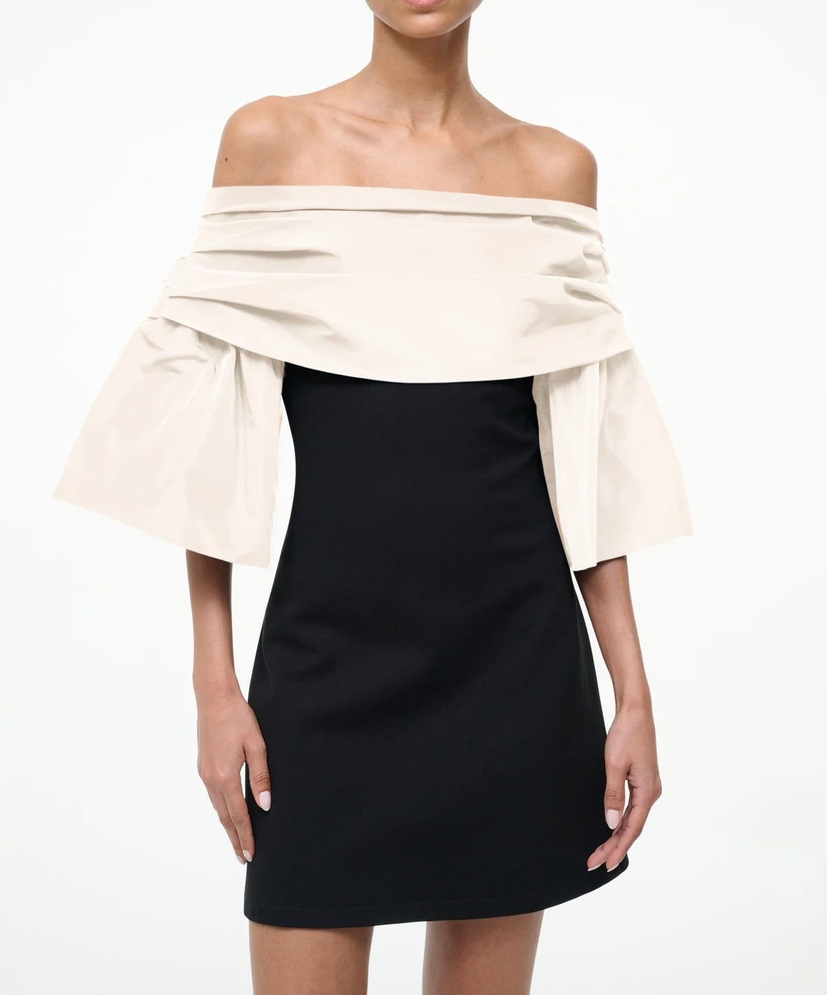 The Harper is a new ponte mini dress, featuring taffeta of the shoulder draped sleeves.