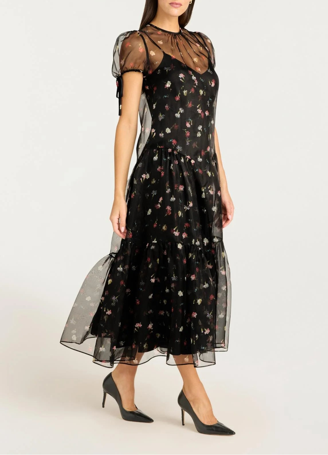 The Tumbling Carnation Kaida Dress combines delicate puff sleeves with ribbon accents and a sheer overlay for a lightweight and fashionable appearance. This midi dress is beautifully decorated with floral details and is an embodiment of sophistication.