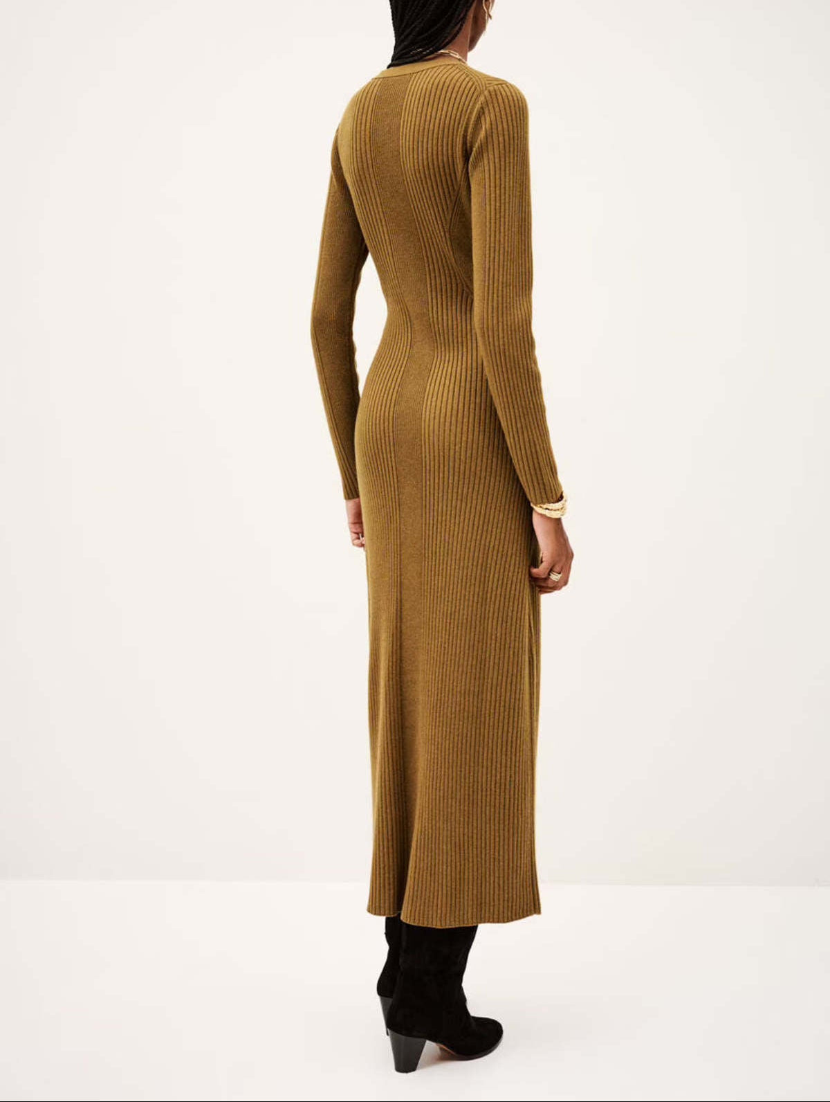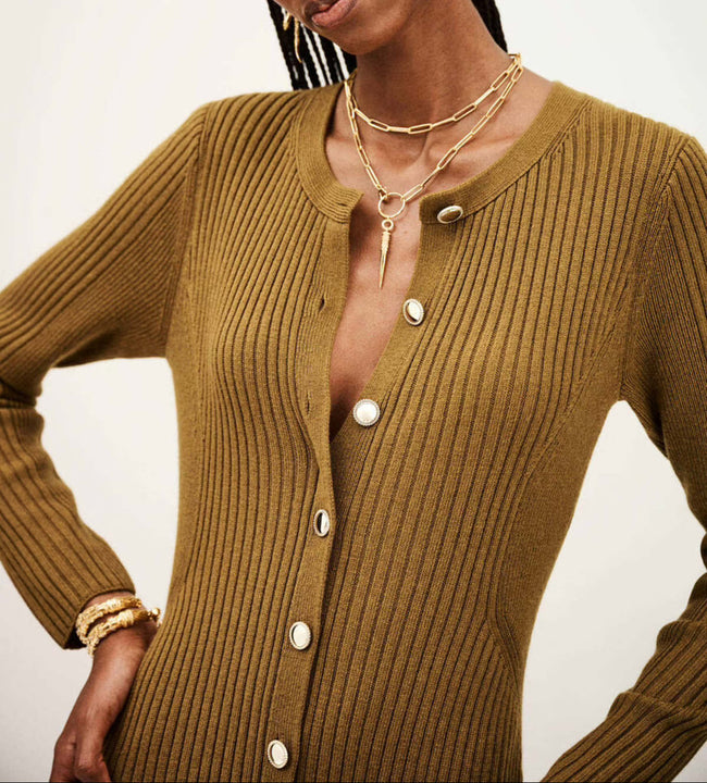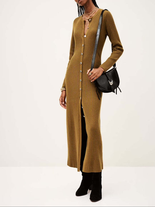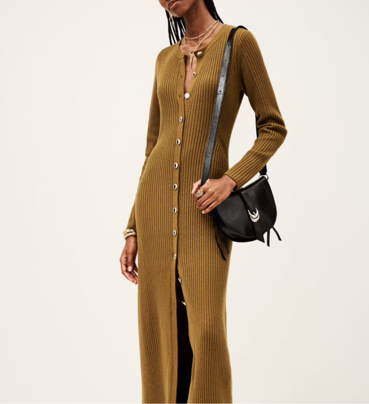 The ba&sh Anisa Dress marries timeless elegance with modern detailing. Crafted from a luxe blend of 50% wool, 30% polyester, and 20% viscose for structure with softness, this midi-length dress features a refined button-front design and long sleeves. The warm bronze tone delivers a subtle metallic glow, making it equally suited for daytime sophistication or evening affairs.