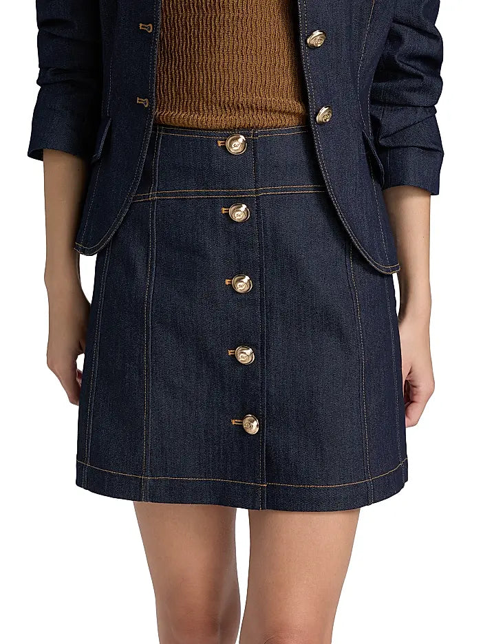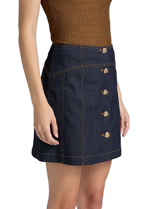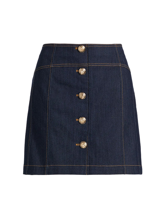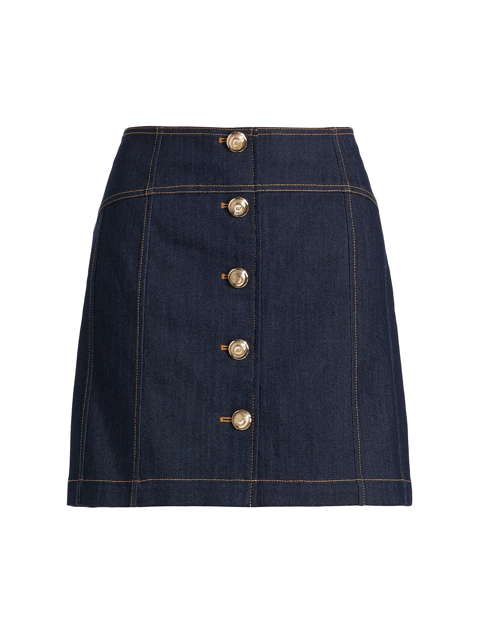 The Claudia skirt from Cinq à Sept is a fresh take on a classic denim silhouette. This timeless design features elegant goldtone buttons down the front and contrast topstitching, creating a refined, polished look.